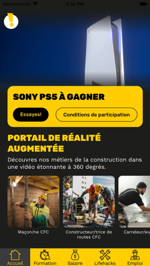 Un portail 360°, des vidéos live et de nombreuses autres découvertes vous emmèneront au cœur de l’univers de la construction et de ses métiers passionnants. Des jeunes actifs vous diront ce qui leur plaît, ce qui les motive, quels défis ils affrontent tous les jours. Découvrez leurs histoires et de nombreuses autres informations sur la branche et ses possibilités de formation et de carrière. L’application donne également accès à une bourse aux places d’apprentissage et de stage dans votre région.