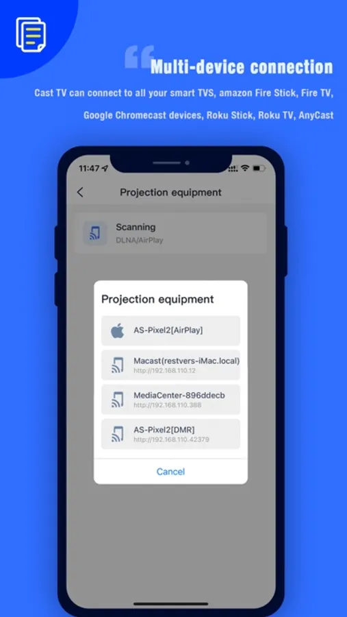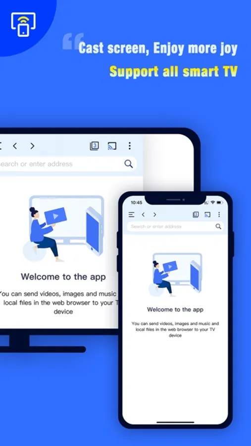 Cast TV is an application that can cast all smart screens in your home, allowing you to easily cast all websites and all local videos, music, pictures, and web pages. Supports quick screen projection of all smart TVs, from your android mobile phone, ios mobile phone, desktop computer, it has never been so easy to screen projection with one click, come and enjoy the happy experience of smart TV screen projection now!Supported Device Types• Smart TV, such as LG, TCL, Samsung, Hisense, Skywort, Sony, Panasonic, Xiaomi, etc.• Amazon Fire Stick, Fire TV• Google Chromecast device• Roku Stick, Roku TV•AnyCast• Other devices that support DLNA protocolSupported Media• MP4, AVI, WMV and other video formats.• HLS live broadcast in M3U8 format for streaming devices• Website Movies, TV Shows, Live Sports• All HTML5 videos• IPTV format (M3U8, W3U, RSS)• Photo, bmp, jpg, png, tif, gif and other image formats• Audio files, mp3, wmv, wav, ape and other music formatsMore features• Automatically search for castable smart devices• Automatically identify the video file projection of the web page• Automatically identify video, audio and picture files on phone and SD card• Easily add local video, audio and other files to the play queue• Multiple video playback modes: random, list, repeat• Photo projection supports slideshow mode.• Support easy operation on mobile phone: pause, volume adjustment, forward/backwardCome and experience your home smart screen projection and enjoy more joy One-click mirror projection to watch your movies and football gamesShare your family photos, family videos with one clickOne-click mirroring of your game to the TV screen for a more exciting experience