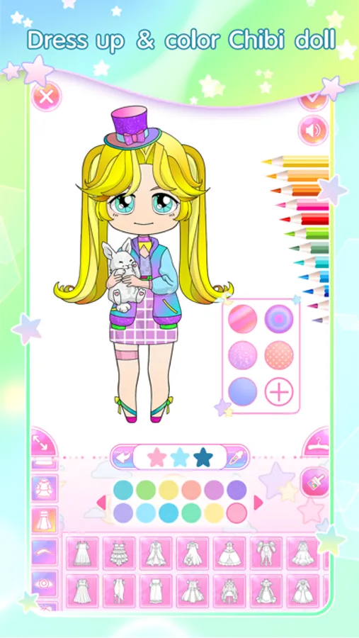 Dress up and color chibi doll in new anime character creator. This free avatar maker gives you the chance to create your own character, enjoy girl coloring games, draw and paint kawaii pictures. Every detail is customizable: change colors, add glitter, use gradients or patterns – cute girl games offline have never been so fun! Color clothes, paint pictures – no limits.