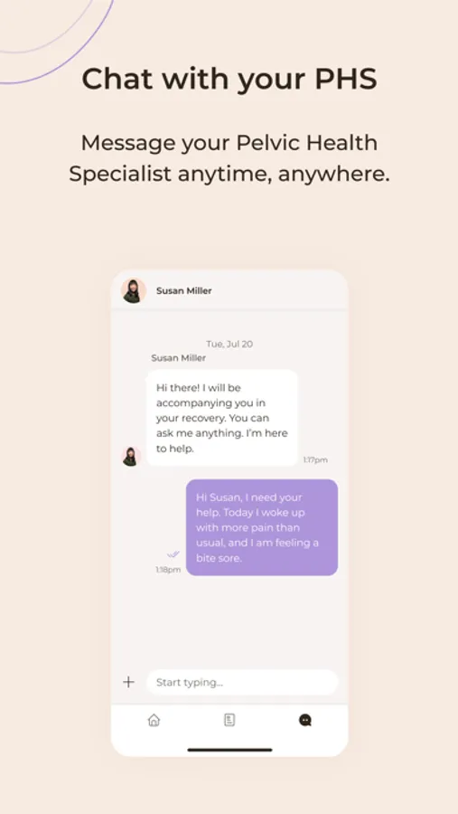 - Chat with an expert: Your Pelvic Health Specialist (PHS) will listen closely and help you reach your goals. Message your PHS anytime, anywhere.