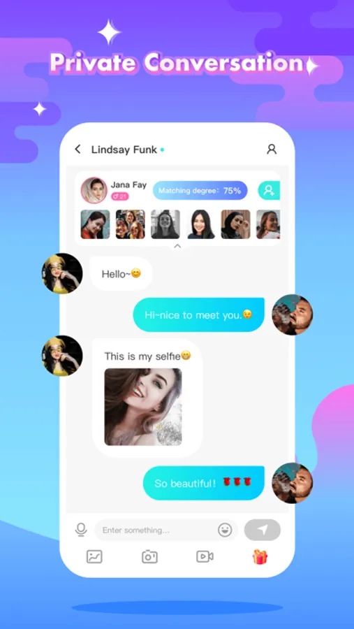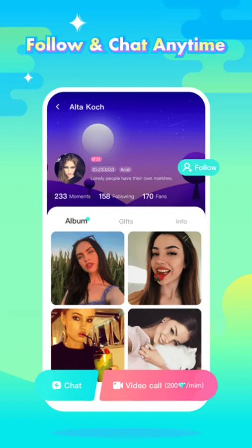 Chat face-to-face with your friends in a one-on-one video call, or text them in text chat mode, and send cute emojis to grab their attention; you're sure to meet new people at here.