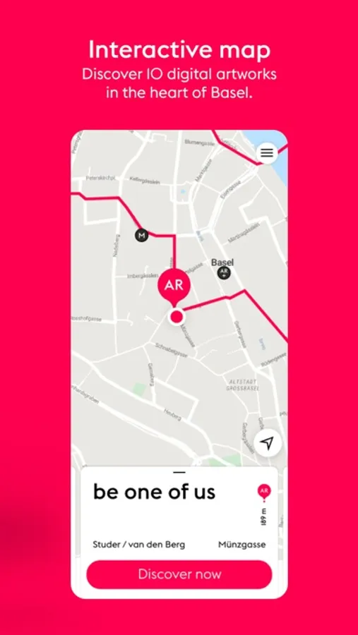 The tour takes you past 10 augmented reality (AR) works of art that can be viewed at different locations in the city of Basel. Use your smartphone and this app for the tour. You should plan around 90 minutes for the whole tour. If you have less time available, you can also visit individual works of art. You can see where the works of art are located on the interactive map here in the app. Once you are there, you can discover the works of art using your smartphone camera.
