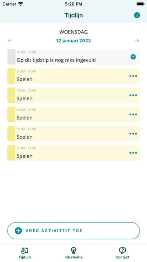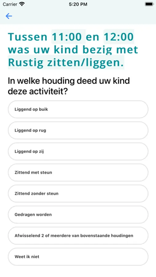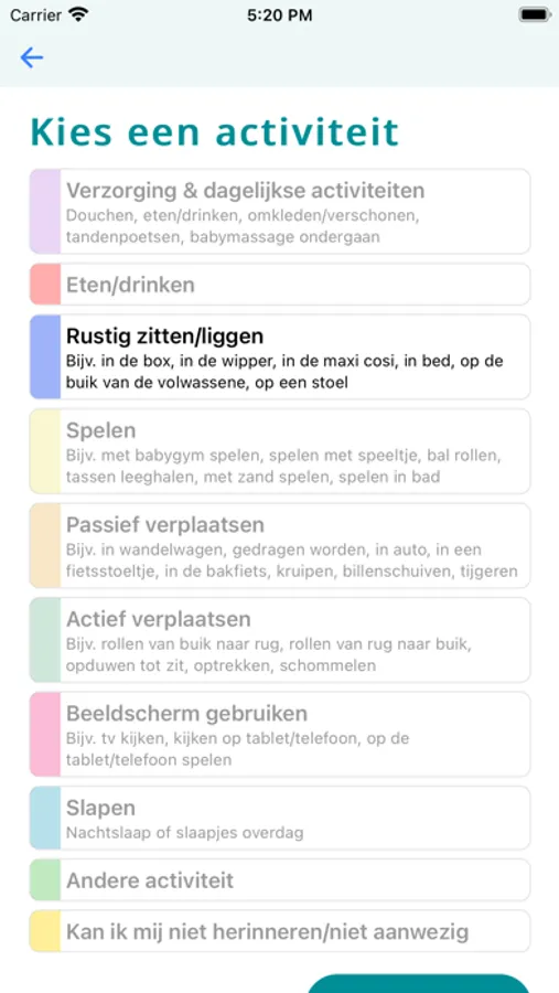 Met deze app kunt u de activiteiten van uw kind invullen in een dagoverzicht. Voorbeelden van activiteiten zijn buitenspelen, een scherm gebruiken en slapen. Zo kan worden gemeten hoeveel uw kind beweegt, zit en slaapt. Ook worden in de app een paar vragen gesteld over de ontwikkeling van uw kind. Bijvoorbeeld of uw kind al kan kruipen of lopen.