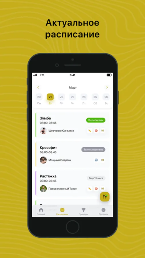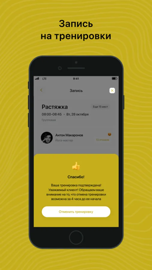 - Получать PUSH-уведомления о предстоящей тренировке за 3 часа;