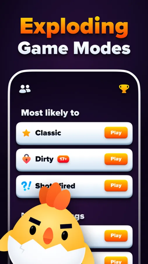Exploding Chicken offers different game modes like Most Likely To, Name 3 Things, or Grammar Nazi.