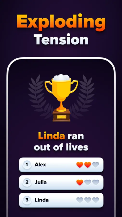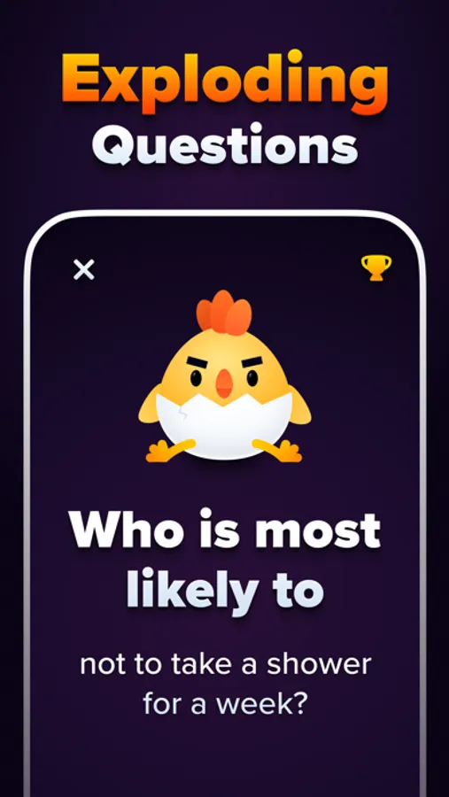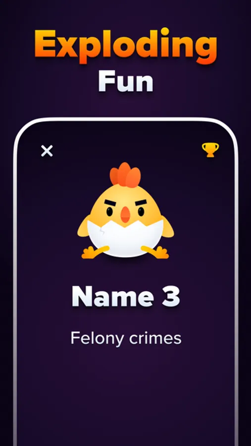 Players must quickly solve different word-based challenges and hand over the phone to another player before the chicken explodes. You lose a life if you hold the phone while the chicken blows up! It's a fun and easy game for groups.
