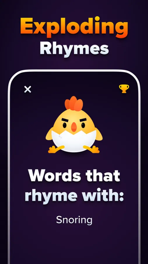 The first player needs to find a word that rhymes with the word you and then hands over the phone to the next player. The next player needs to find a word that rhymes with the first player's word. The game continues until the chicken explodes. Using words twice is not allowed.