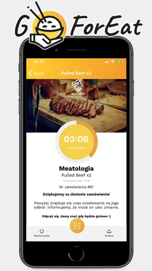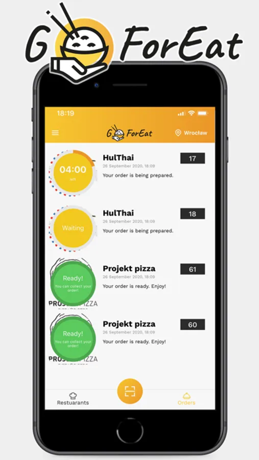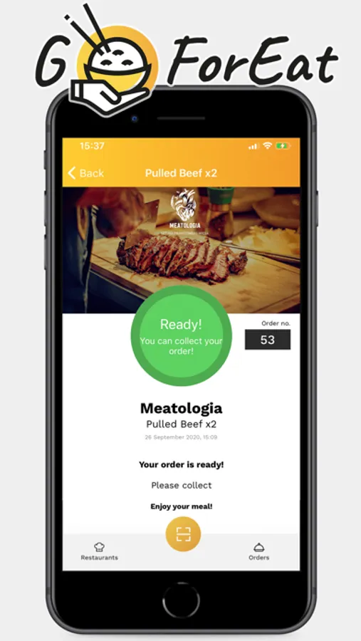 GoForEat notifies you as soon as your order is ready. We have developed a QR code based notification system. Restaurateurs love how with two clicks they can generate a QR code which is then scanned by the customer. Regulars scan with the app, whereas newbies can simply open their camera* and point at the code, the link will then open in their browser - no app required, so anyone can use it hassle-free.