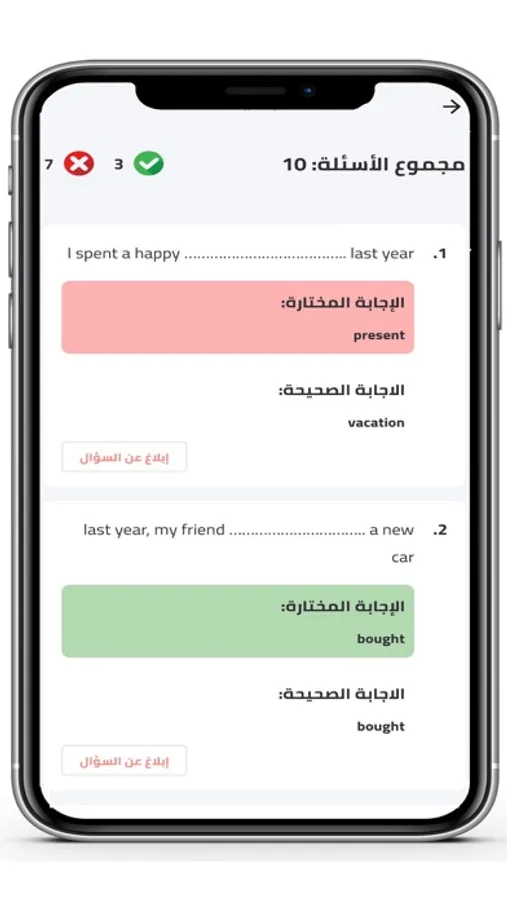 4- وجود شاشة للإحصائيات لمقارنة المجموع الكلي للاسئلة التي تم الاجابة عليها مع مجموع الاجابات الصحيحة