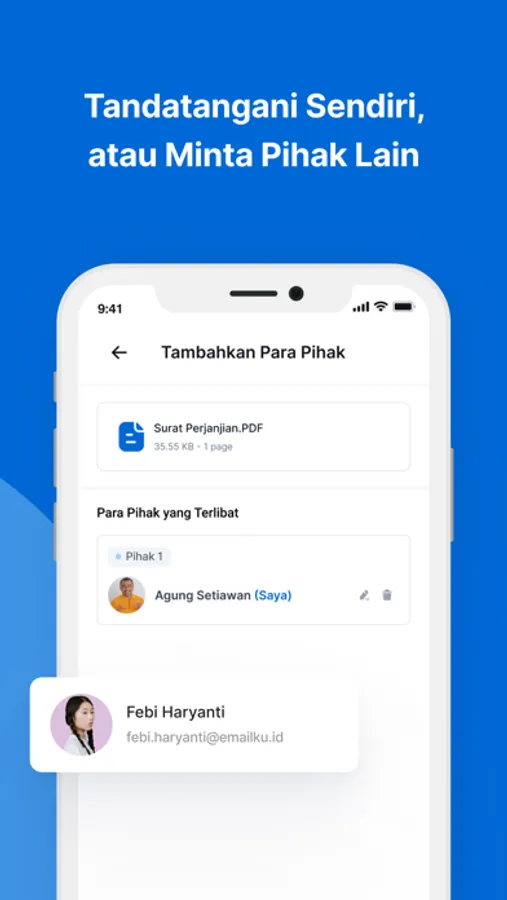 - SIGNATURE REQUEST: Meminta pihak lain yang terkait untuk ikut menandatangani dokumen elektronik dengan cepat dan praktis.