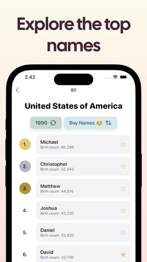 Not sure where to start? Check out our Top Lists feature to see the most popular names in countries such as the United States, United Kingdom, and many more. Our app is constantly updated with the latest name trends, so you’ll never be out of the loop.