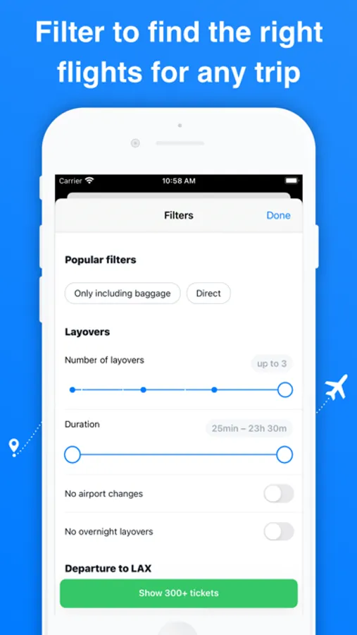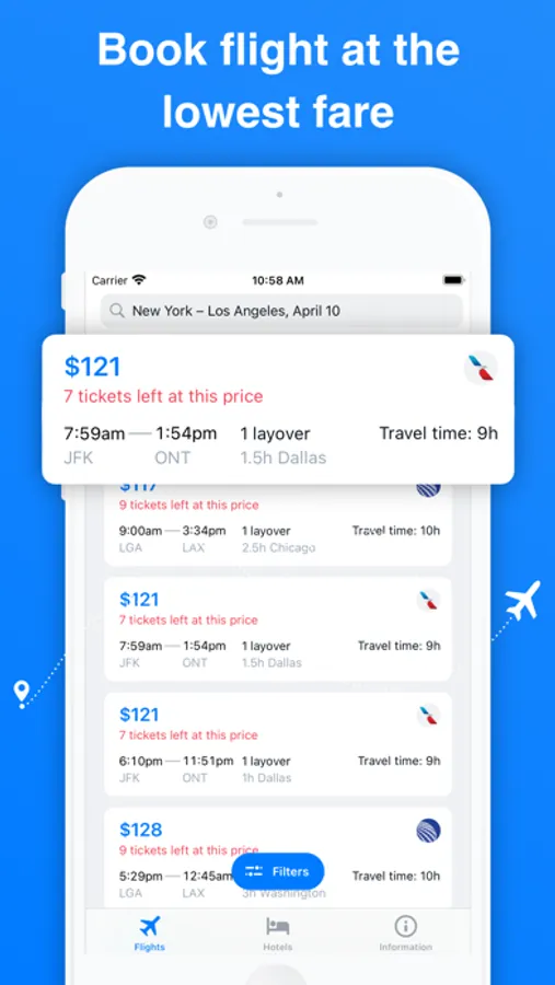 Flexible Filtering Options: Search for cheap airline tickets however you want, whenever you want. Narrow flight searches by a number of stops, total price, journey time, stopover duration, and more. AirTravel provides recommendations for cheap flights based on your preferences!