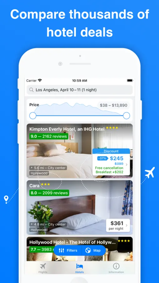 • Explore options with Price map: A convenient price map displays cheap plane tickets across several destinations. Pick a place, book flights with peace of mind, and save. Low-cost airlines can take you places you’ve always wanted to see!