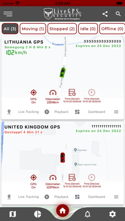 Das Gerät liefert die Daten dann an die von LiveGPS24 Security Systems gehostete Server, auf die Sie jederzeit über das Internet zugreifen können. Sie erhalten Echtzeit-Updates zur Fahrzeugverfolgung, einschließlich Standort, Richtung, Geschwindigkeit, Leerlaufzeit, Start/Stopp und mehr, sodass Sie einen strafferen Zeitplan und eine effizientere Flotte verwalten können.