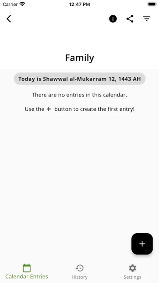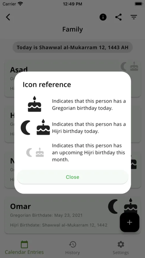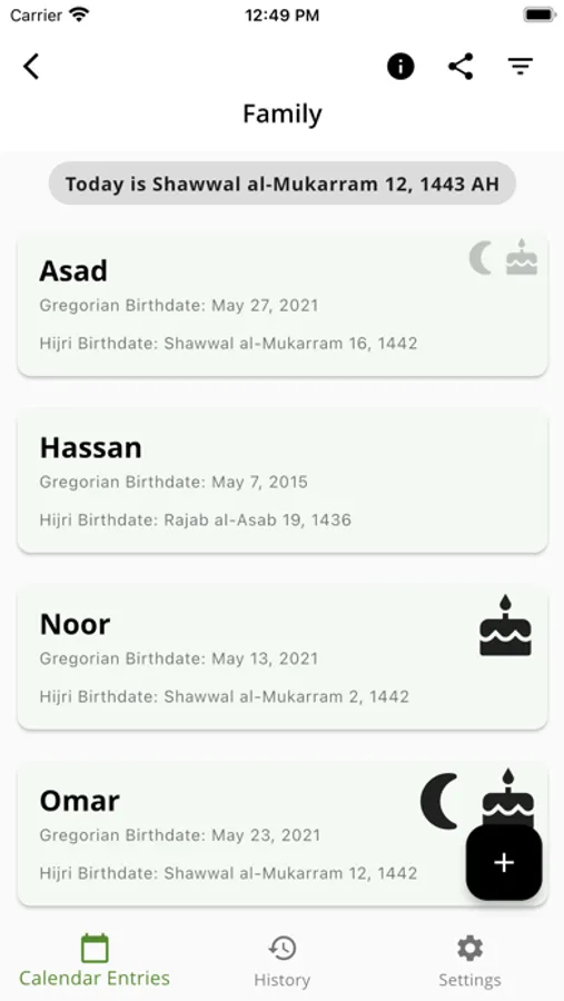 Add calendar entries to receive birthday reminders. Create the calendar entries in the Gregorian date format, and the app with automatically keep track of the Hijri (Misri) date, and send you birthday notifications.