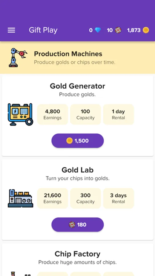 In the "Production Machines" section, you can rent a machine and produce golds and chips over time.