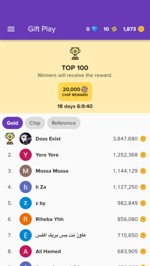 You can see the leaderboard in TOP 100 section. You can compete with other users. Every month, the leaders in three categories (gold, chip, invite) will get the prize.