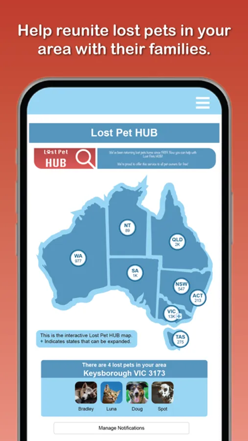 - Help reunite lost pets in your area with their families using our national Lost Pet HUB service or list your missing pet on the Lost Pet HUB to notify pet owners, vets and councils in your area.