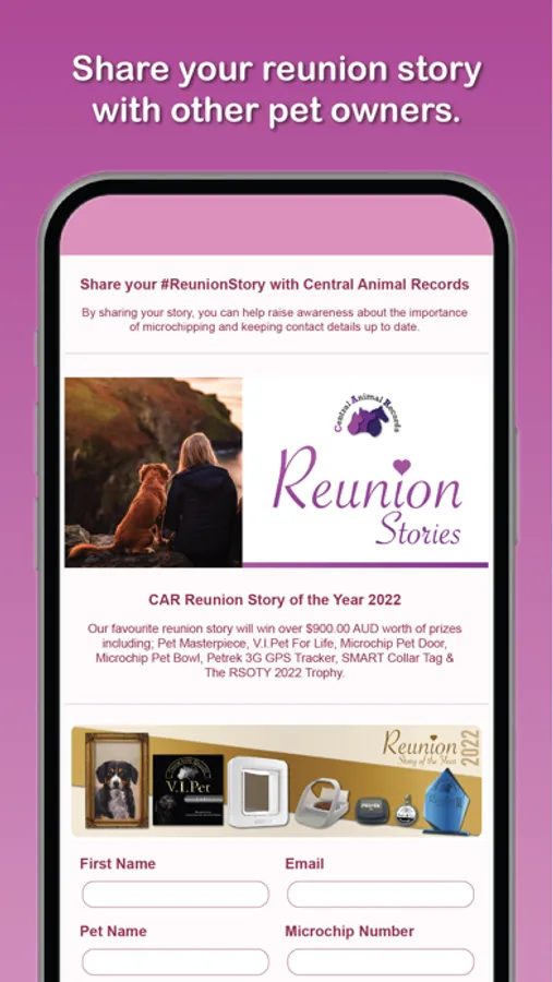 - View heartwarming reunion stories or share your own story with other pet owners to give hope to families who are still waiting for their pets to find their way home. E very submission will have the chance to win our $900 'Reunion Story of the Year' grand prize.