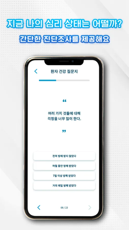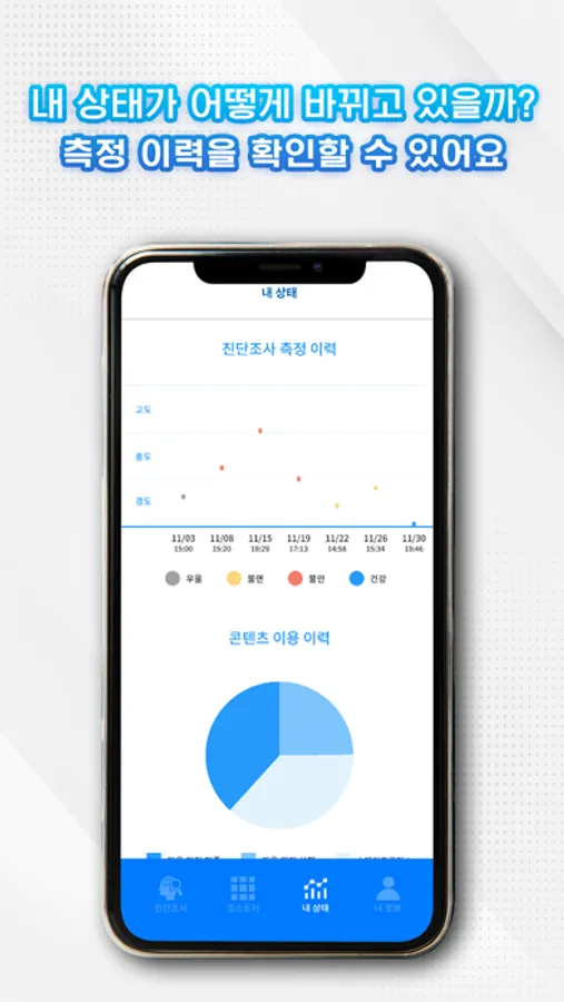 진단조사를 통하여 사용자의 심리 상태를 파악하고 우울, 불안, 불면 등의 문제가 있는지 확인할 수 있습니다. 결과에 따라 사용자에게 각각 맞는 콘텐츠를 추천합니다.