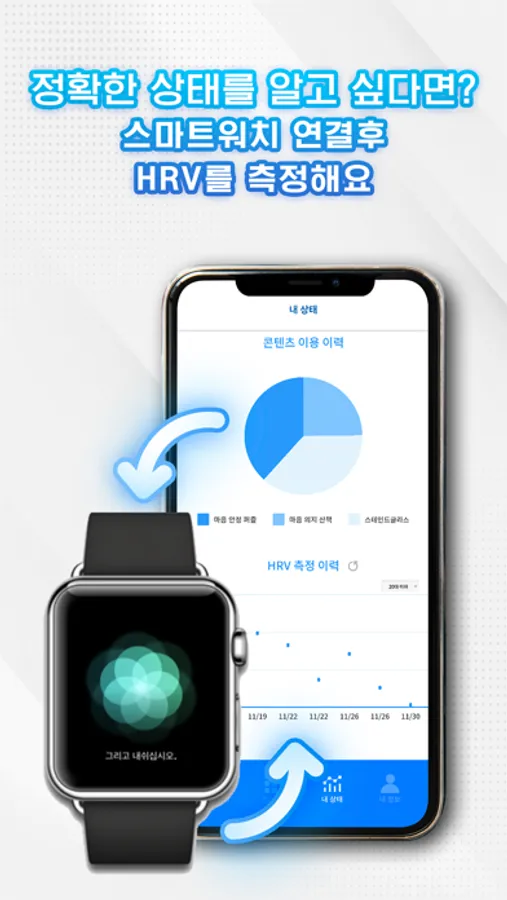 스마트 워치를 연결하여 콘텐츠 실행 전후로 스트레스 지수를 측정하고 기록합니다. 기록 그래프를 보여주어 사용자의 상태를 한 눈에 파악할 수 있습니다.