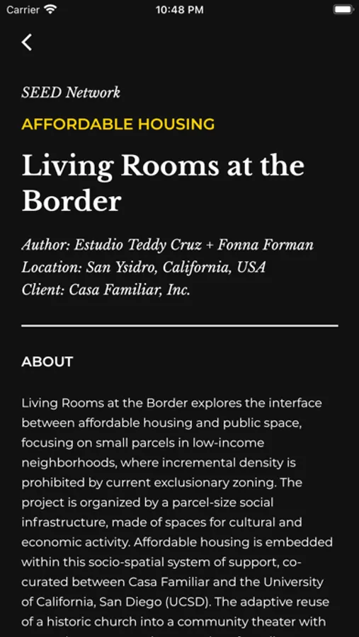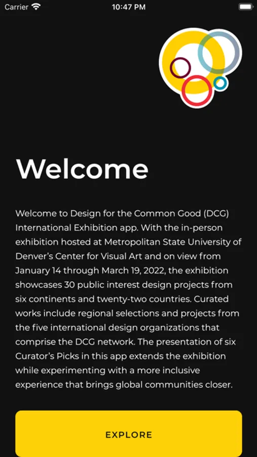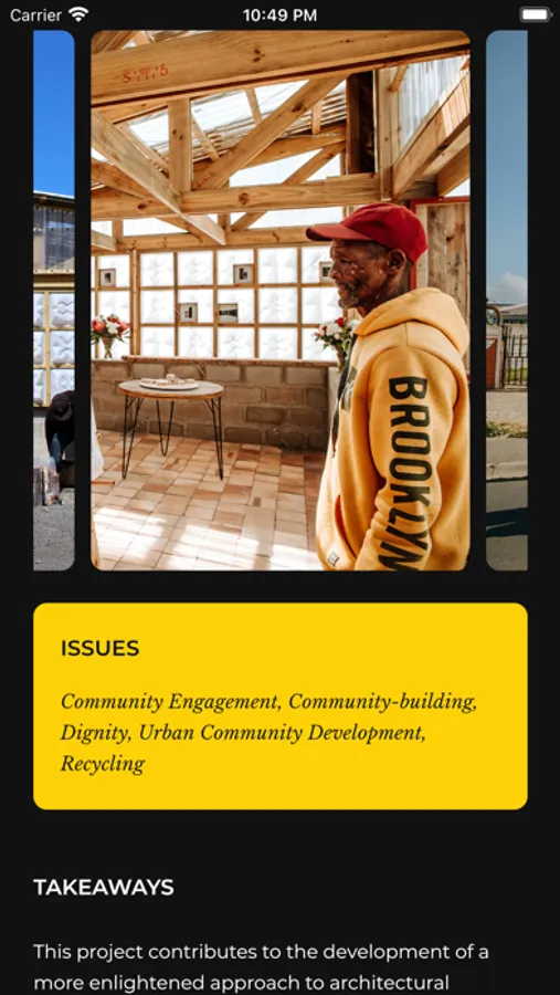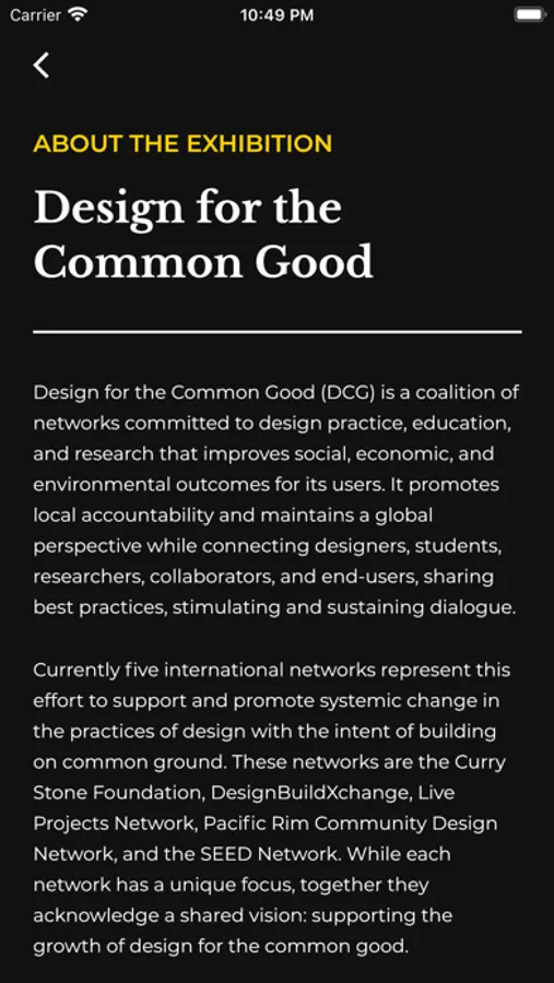 The app features a personalized glance of six Curator's Picks that are a part of a larger in-person exhibition hosted at Metropolitan State University of Denver's Center for Visual Art; on view from January 14 through March 19, 2022. Like the app, the exhibition showcases public interest design projects from six continents and twenty-two countries. Learn about these pertinent works and gain a detailed archive of all projects, authors, and locations within the exhibition.