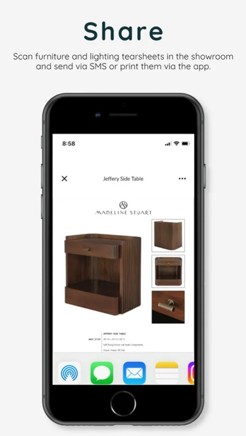 Scan the QR code noted on each price tag of items on the showroom floor to have the tear sheet immediately saved to your designated project. Share with clients and colleagues for immediate feedback.