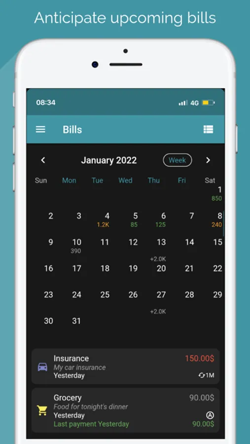 By tracking your bills and invoices, you will be able to track upcoming payments. Get reminders for your bills and never miss a payment anymore! Save on late fees that stack up monthly. Use our calendar to see your monthly bills in a snap. Or use our list view to see them grouped by due date.