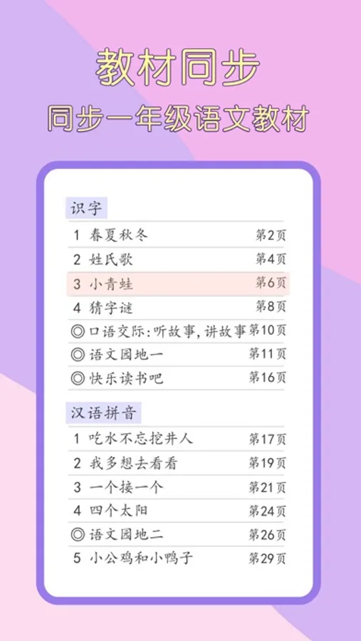 涵盖教材全部内容,让您全面掌握拼音字母、生字、词语、句子、课文、故事、诗歌等课程内容,让孩子在轻松快乐中学习!