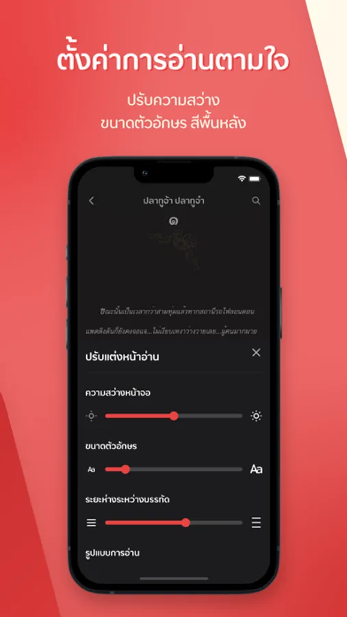 - ตั้งค่าการอ่านดั่งตาฝัน ปรับความสว่าง ขนาดตัวอักษร สีพื้นหลัง ปัดซ้าย-ขวา บน-ล่าง ตามใจถนัด