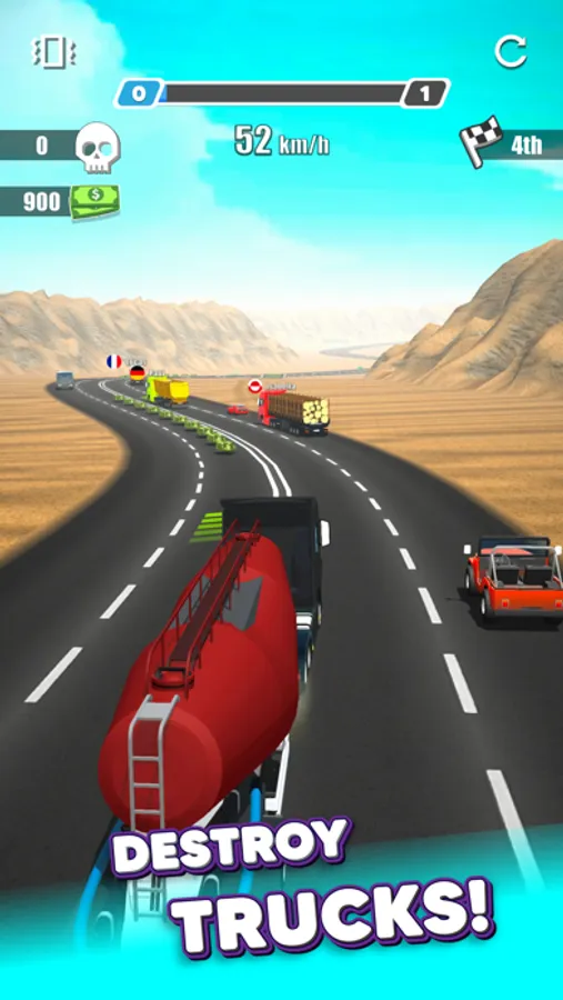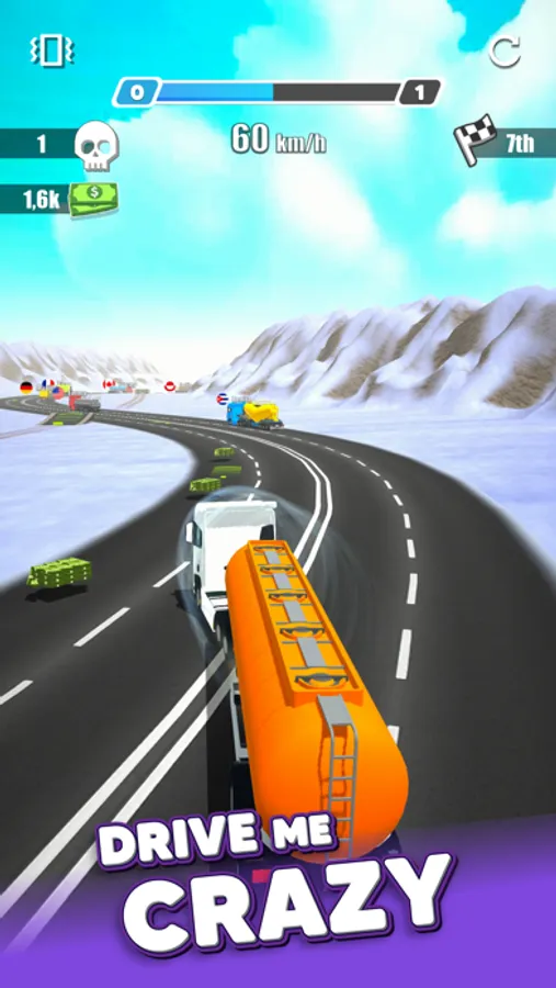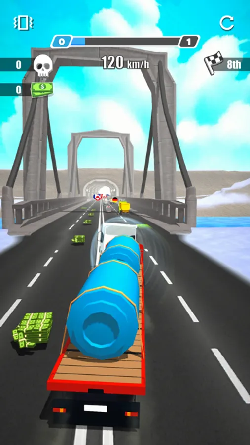 Truck drivers got bored of carrying loads and started a crazy race with their trailers. In this race, start from the back row and pass all the trucks one by one in the traffic. Traffic rules are completely disabled, the only rule is to reach the finish by passing as many opponents as possible. On the other hand, you may want to eliminate the opponents you pass. In this you earn extra money. Of course, another option is just to blow up the bales of money lined up on the road.