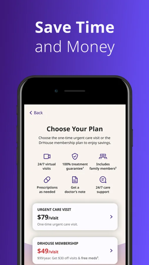 A one-time visit is $79, and you get 7 days of free care support—no free Rx & delivery option. You can pick up and pay for your meds in your preferred pharmacy. With the DrHouse membership, all visits are $49. Membership is only $99/year, and you get free Rx & delivery, 24/7 online doctor visits, and unlimited care support. Membership includes your family members!