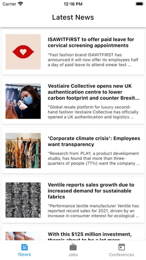 Stay up to date with news and reports as they break. News is global, so you will also find story summaries from other languages, particularly from local sources in major supply chain countries (such as Bangla, Khmer, Vietnamese, Turkish, Arabic, Spanish, and more). The Kyna Intel app also features our job and event boards, keeping you up to date with newly opened positions in sustainable fashion and upcoming industry events.