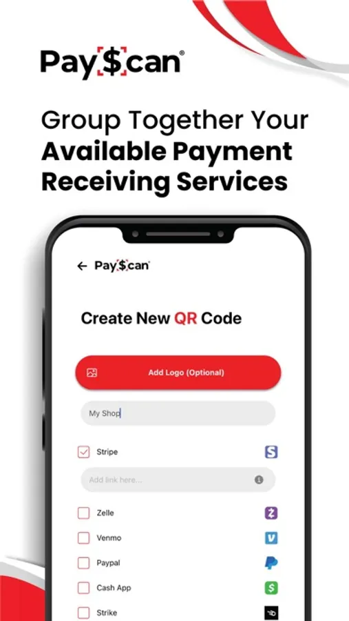 PayScan allows you to group all your available payment receiving links or information and save them behind a QR code and URL. Any user can scan and reveal the payment options by scanning the QR code in the PayScan app or by opening the URL. Then sender is able to select the easiest way he/she finds and proceed to pay (off the platform inside a web view or any other app).