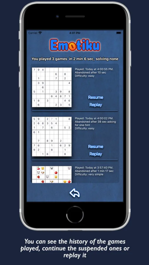games history: you can see the list of the last games played, resolved or suspended. From here the player can resume a game (only the suspended ones) or replay it again from the beginning.