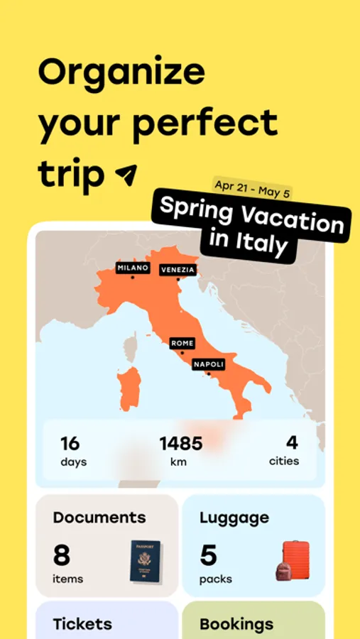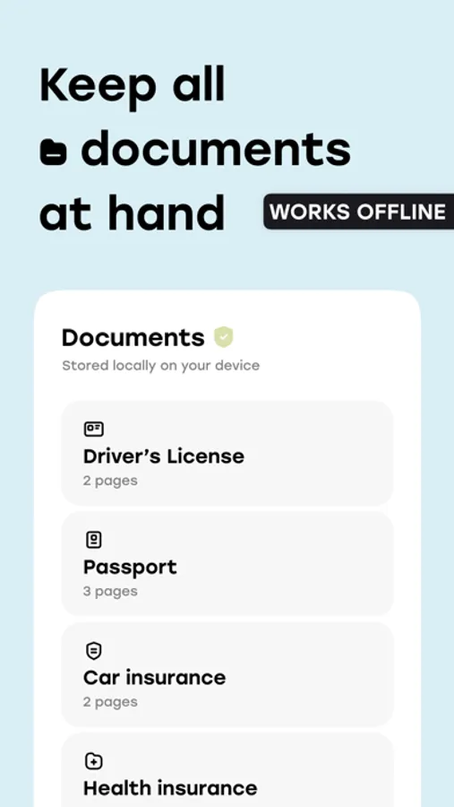 Upload the documents you need for every trip right to the app, be it your passport, identity card, health insurance or driving license. Moreover, you can store all your tickets and hotel bookings.