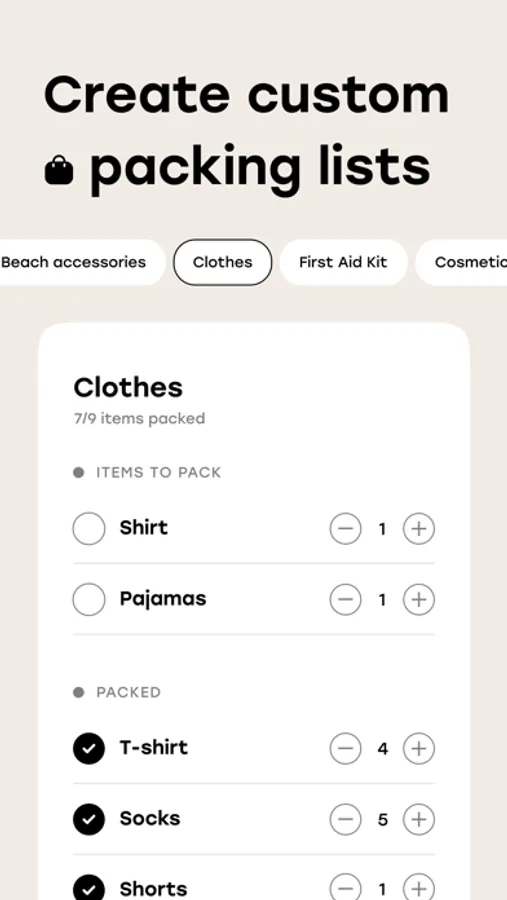 Have you ever forgotten your headphones, favorite t-shirt or, even worse, documents at home? Be sure that nothing will slip out of your mind any more: you can create any packing list you need. Whether you are traveling on business or planning vacation at the seaside, you can customize packing lists for any specific purpose.