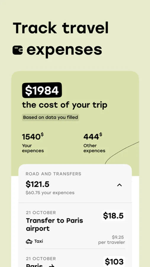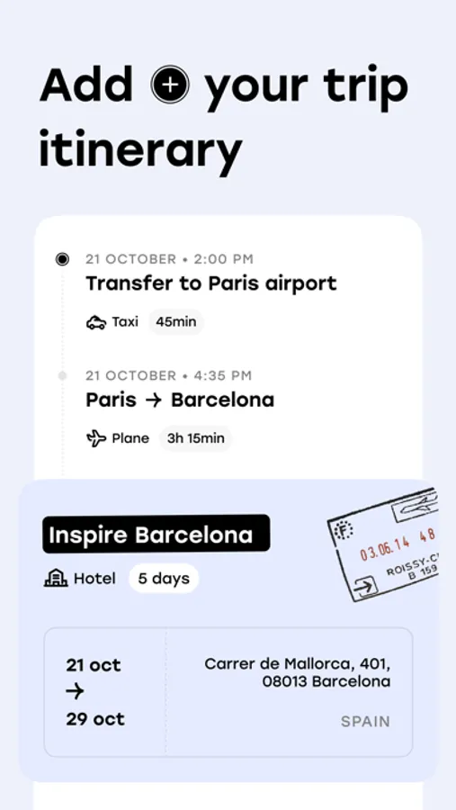 All the tickets, transfers, car sharing services, sightseeing, meetings with friends or colleagues and other activities are stored in one place! No need to check your notes, calendar or daily planner. Just upload all the info in advance into the app, and you’ll always have it at hand.