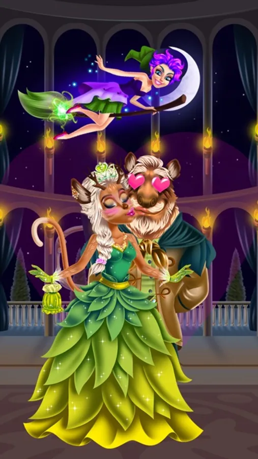 Finally you can asist at this lovely date and see this couple together with their new look. You can see in their eyes the happiness so they want to kiss each other but the problem is that the evil witch is around and she should not see them kissing. Help the couple kiss without being seen!