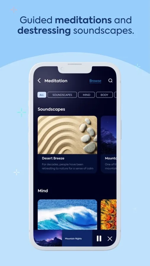 • Listen to calming guided meditations for any goal or purpose by choosing from topics arranged by category (i.e., mind, body, work, relationship, personal growth, and addiction)