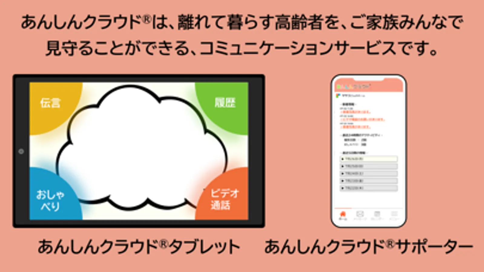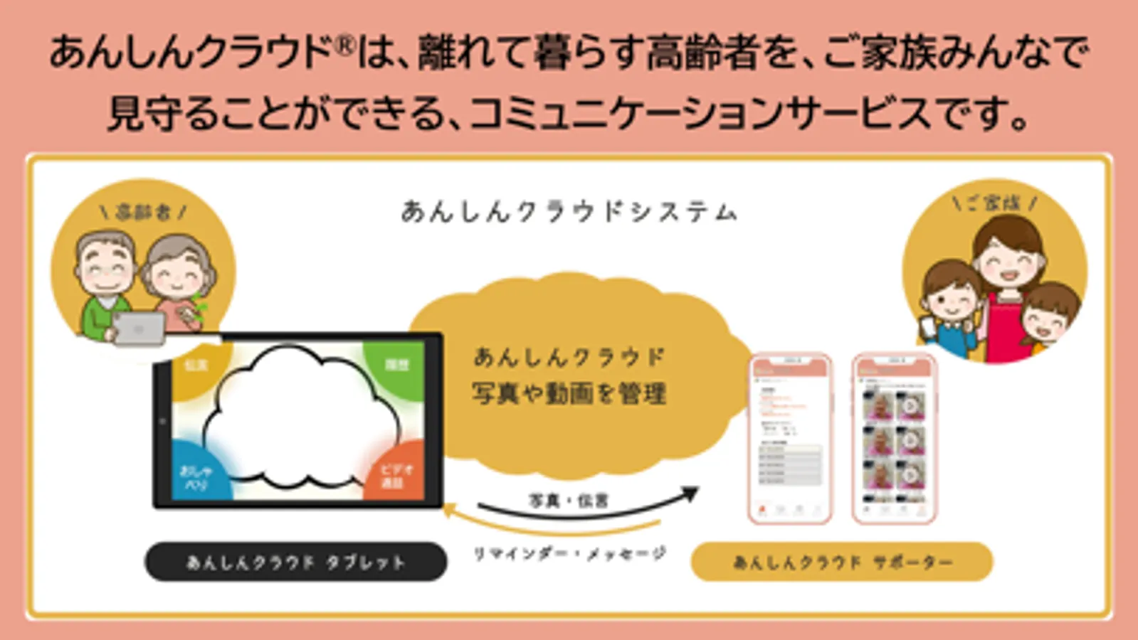 ご高齢者が使うタブレットアプリ「あんしんクラウド® タブレット」と、ご高齢者を見守るご家族が使うスマートフォンアプリ「あんしんクラウド® サポーター」があり、タブレットとスマートフォンが繋がることで、見守りやコミュニケーションが可能となります。