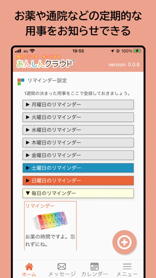 ◉リマインダー機能で、ご高齢者の定期的な用事(通院やゴミ出し、薬の服用など)をお知らせできる