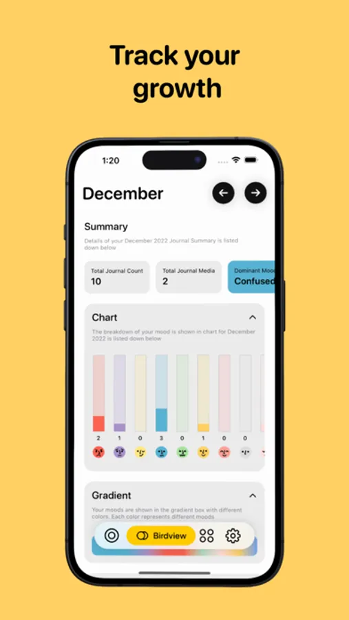 • Breakdown details of your Journal journey in chart, gradient, and calendar form