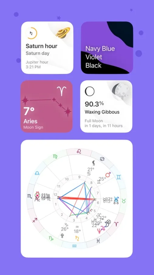- 5 widgets (Current Chart, Planetary Position, Color of the Day, Gemstone of the Day, Major Aspects)