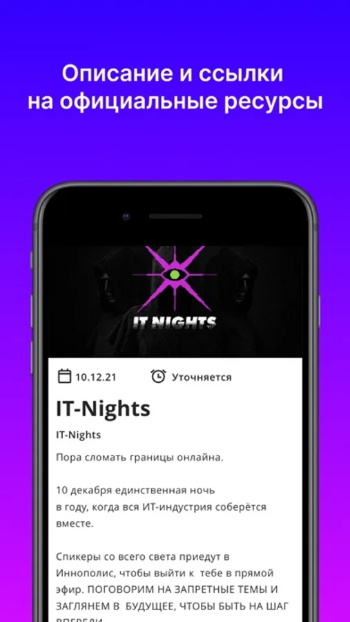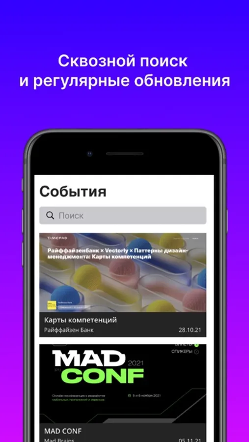 Описания событий IT-индустрии, ссылки на официальные ресурсы, сквозной поиск по приложению и регулярные обновления.