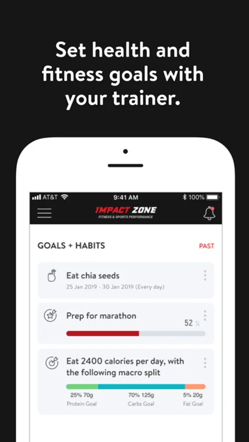 With the Impact Zone Fitness App, you can start tracking your workouts and meals, measuring results, and achieving your fitness goals, all with the help of your personal trainer.
