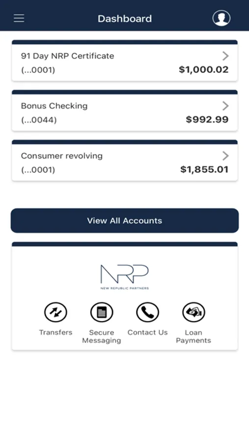 The NRP Business Banking mobile application enables authorized clients of New Republic Bank to access account data with a simple, useful interface. Performance reports are provided for specific time frames and account types.