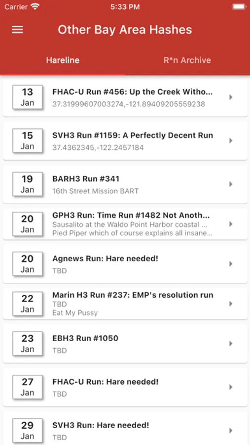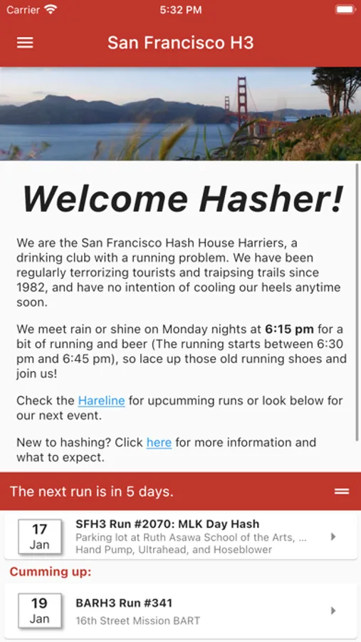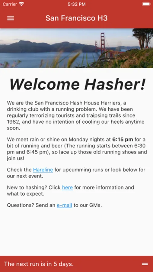 We meet rain or shine on Monday nights for a bit of running and beer. so lace up those old running shoes and join us! You can get more information about our runs using this app or by visiting our website, https://www.sfh3.com.