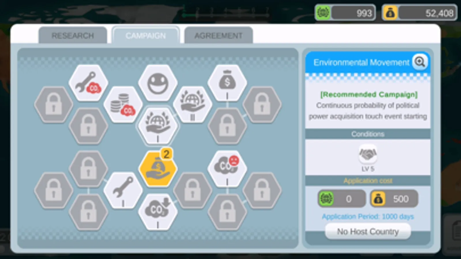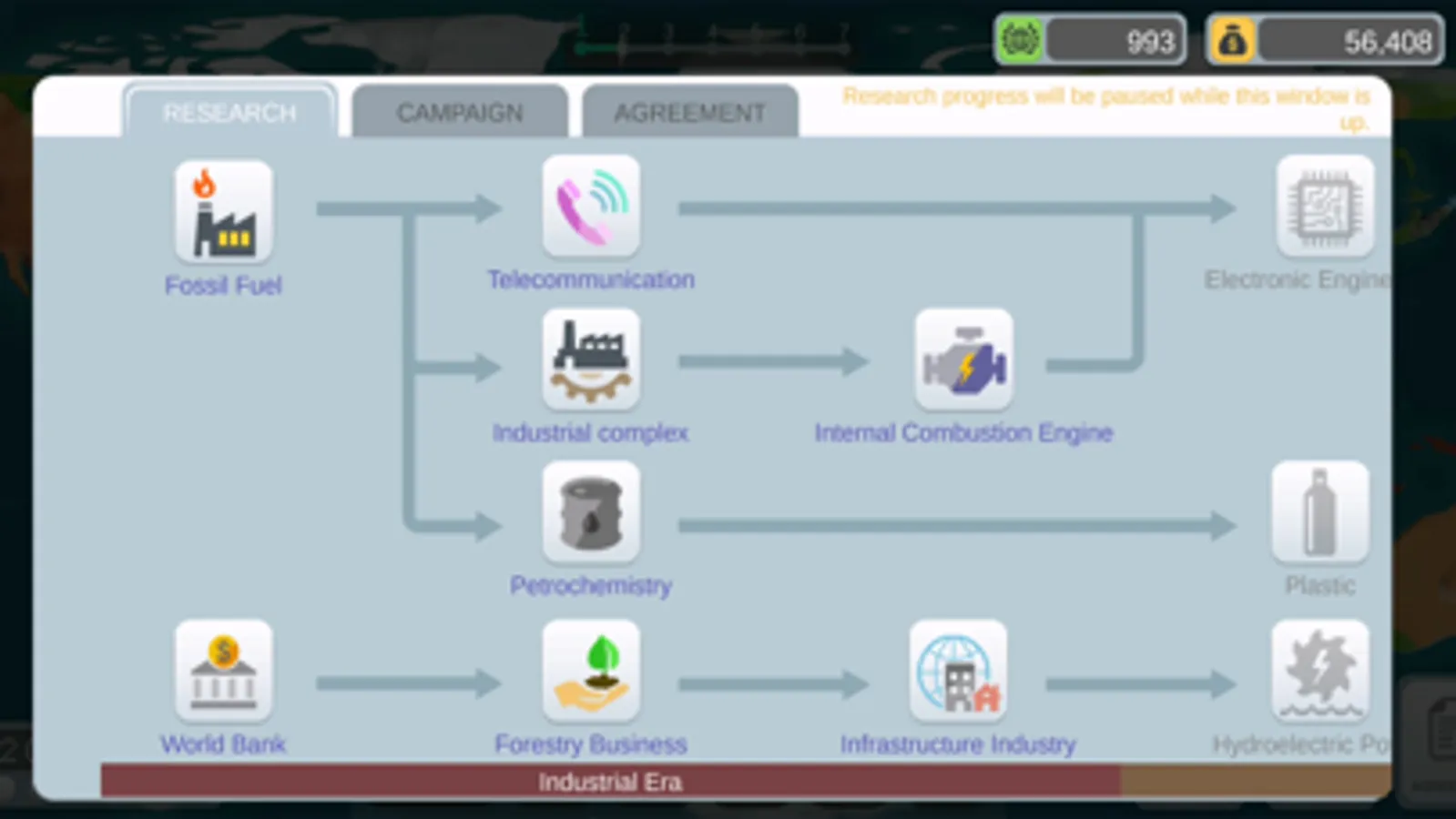 #Research - This is the function to study various policies and technologies. Before you can run a campaign or agreement, you must do some research related to its features. You need to research [Petrochemistry] to be able to proceed with the [Recycling Campaign] to extract petroleum from waste plastics