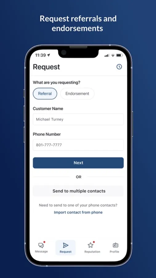 - Send referral requests to one contact or multiple contacts at once. Choose contacts from your phone or from saved contacts in the app